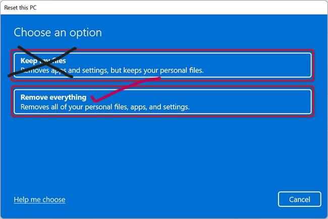 Once selected, the "Reset This PC" window will appear. You'll have two options to choose from: