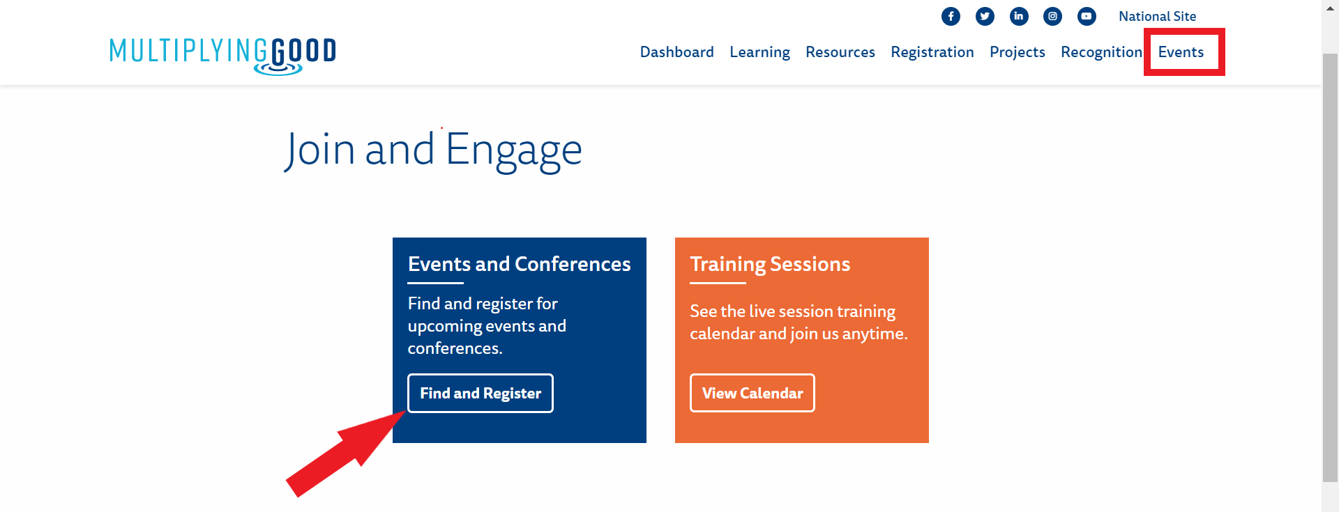 The “events” tab is where you will go to gather information and register for all events, conferences, and training sessions. Right now, you can register for an SIA Leader Summer Session by clicking on the orange “view calendar” button and selecting the session you would like to attend. Once the registration for Fall Leadership Conferences is open, you will register for your conference by clicking on the blue “find and register” button and selecting the conference for your region.