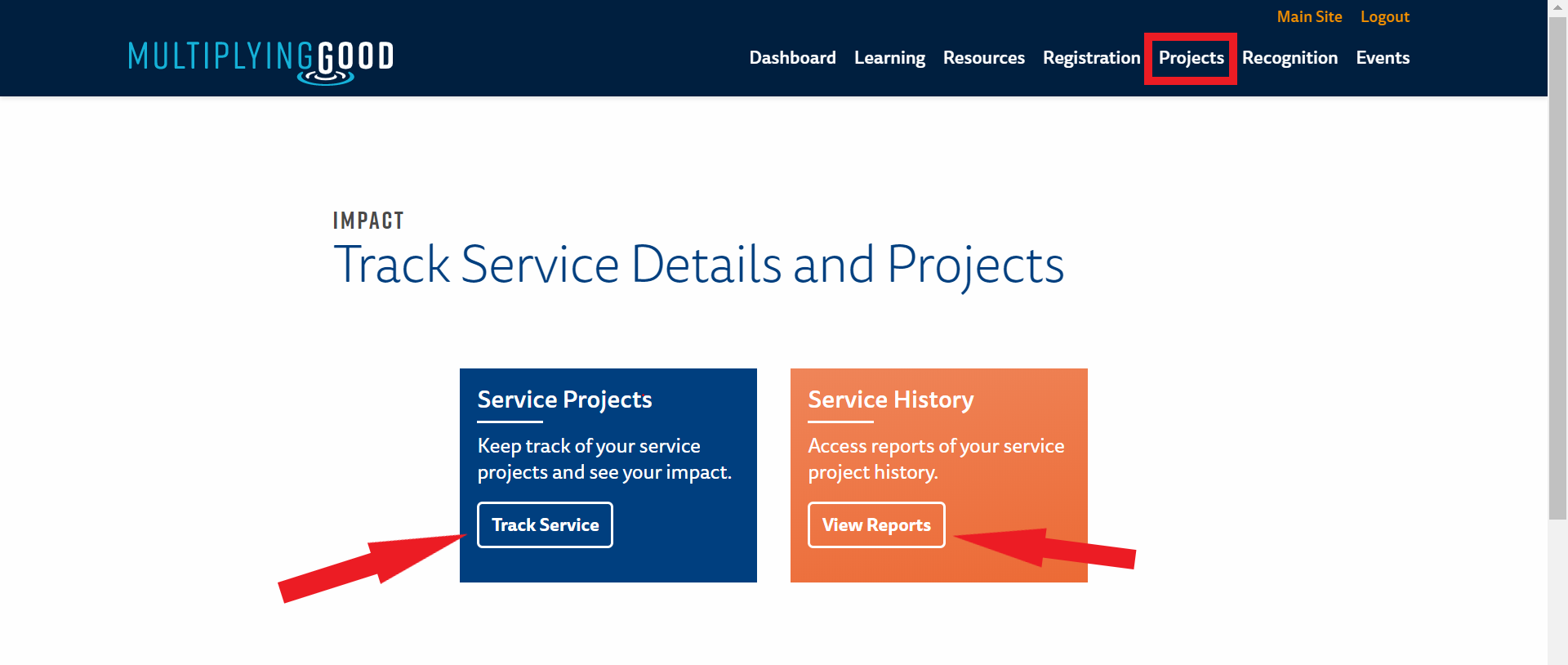 The “project” tab is where your team will go to track their service projects and view their service history. To track a service project for your team, simply click the blue “track service” button and complete the form. To view the service tracking forms submitted on behalf of your Students In Action team, simply click the orange “track service” button.