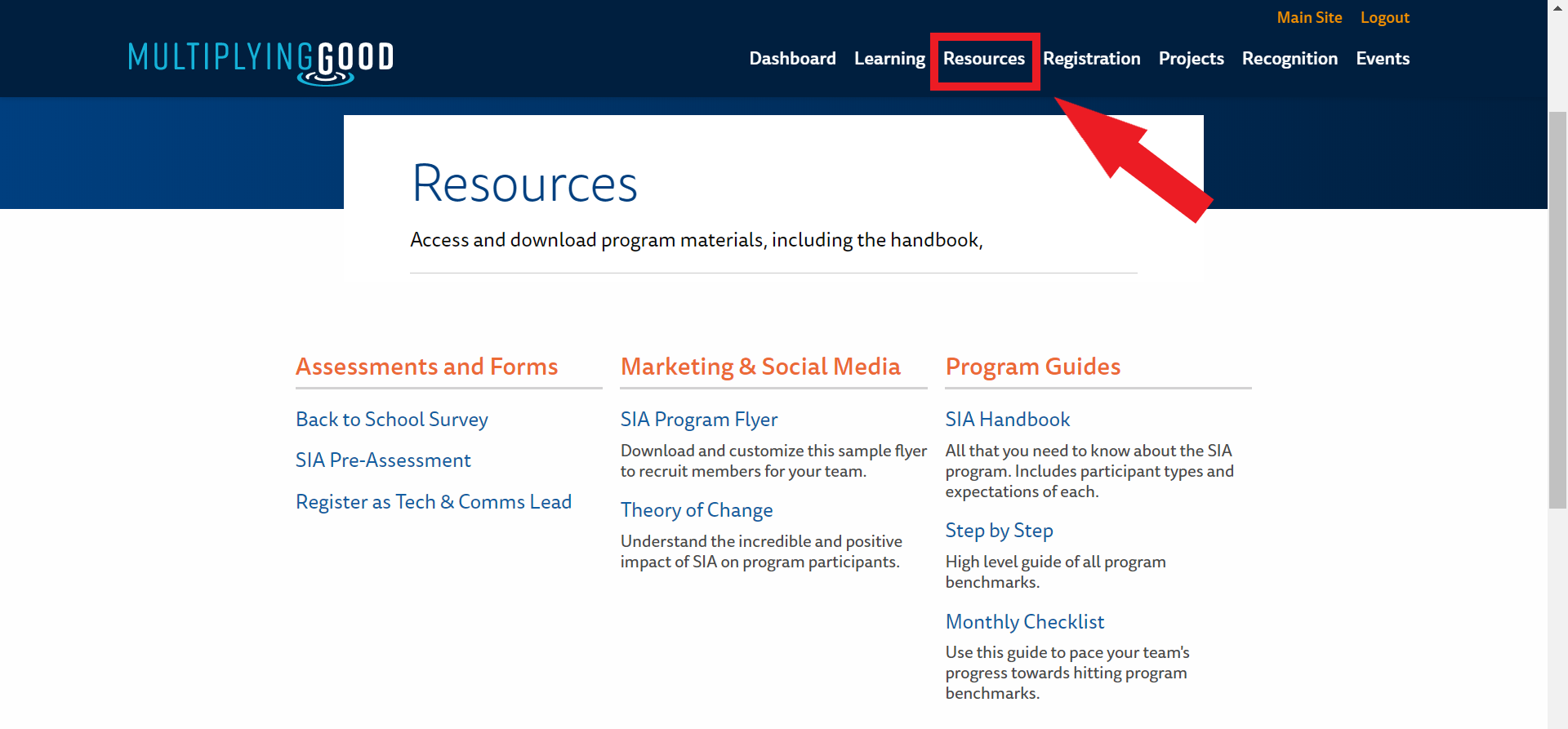 The “resources” tab contains an abundance of resources that are available for your SIA team. Here, you can find our active assessments and forms, material to support your team around marketing and social media, and program guides to help you navigate the year.