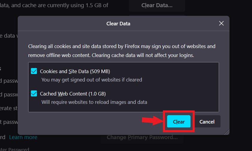 • When clearing all cookies, confirm by clicking on the “Clear” button.