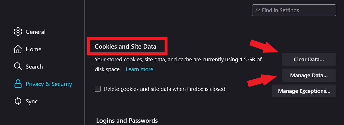 4. Scroll down to the “Cookies and Site Data”. If you want to Delete all Cookies you can click “Clear Data” or to clear specific cookies click “Manage Data”.